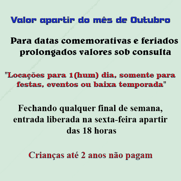 "Locações para 1(hum) dia, somente para festas, eventos ou baixa temporada"